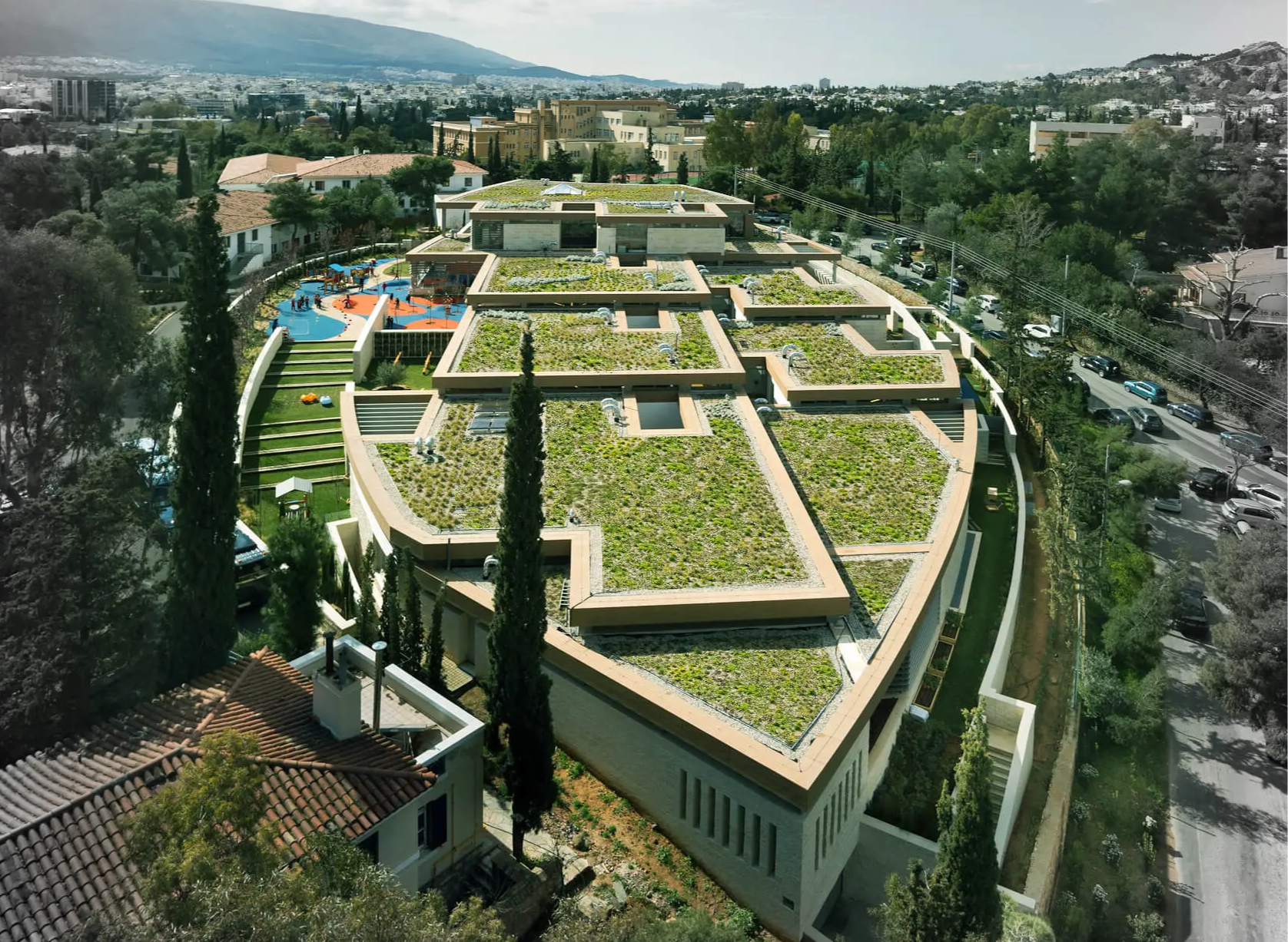 El jardín de infantes y preescolar HAEF, un edificio de dos pisos y 3,400 metros cuadrados con una forma similar a un pez, fue el primer edificio en obtener la certificación LEED Platino en Grecia.