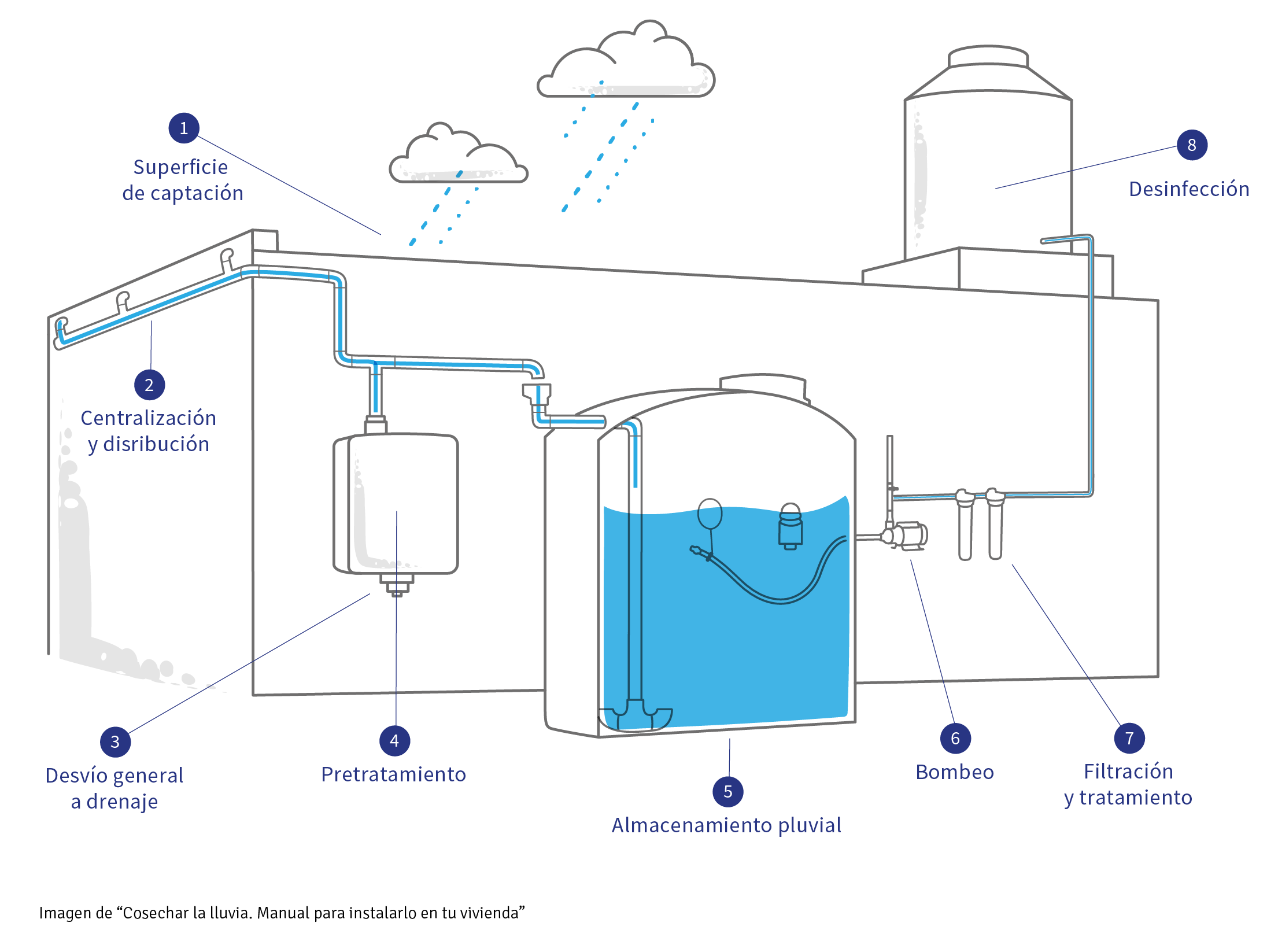 Un sistema de recolección de agua de lluvia consiste en un conjunto de mecanismos que incluyen canaletas, tubos, filtros, tanques, bombas, entre otros, para captar, conducir, almacenar, tratar y utilizar este recurso, tanto para usos potables (consumo y contacto humano) como no potables (sanitarios, riego, uso industrial, limpieza, etc.).